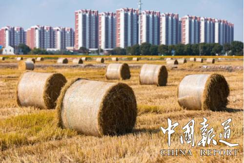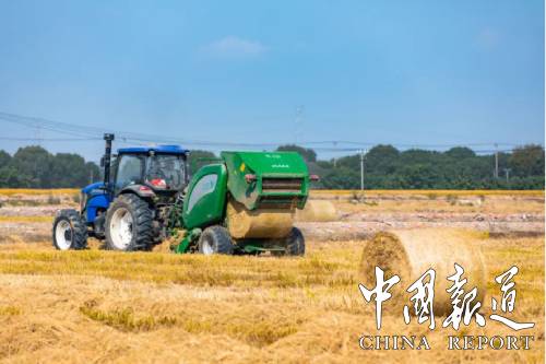 秸秆打捆机也出现在收割后的稻田里,将散落的秸秆搂起,压实、打捆,秸秆被整齐有序地码放在田野里,成了一道靓丽的风景。