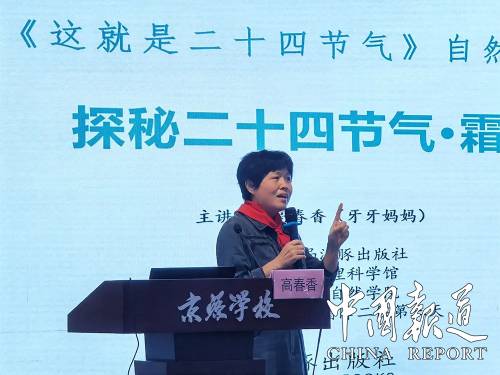 高春香老师为现场的老师、学生们带来了一场精彩的节气公开课,不仅科普了二十四节气的起源、重要意义和科学内涵,而且她以绘本中“霜降”小节的内容为例,通过故事解说、历史由来、天文气候、古诗谚语、七十二候、动物植物、农事活动、民俗节日等八个方面深入浅出地解读了霜降节气的奥秘。随后,她细致介绍了观测记录二十四节气的科学方法,号召学生、教师、学校都行动起来,在日常的校园环境创设和课程活动中,多多关注身边的自然变化,养成长期观察记录的好习惯,做传承续写二十四节气的节气使者。