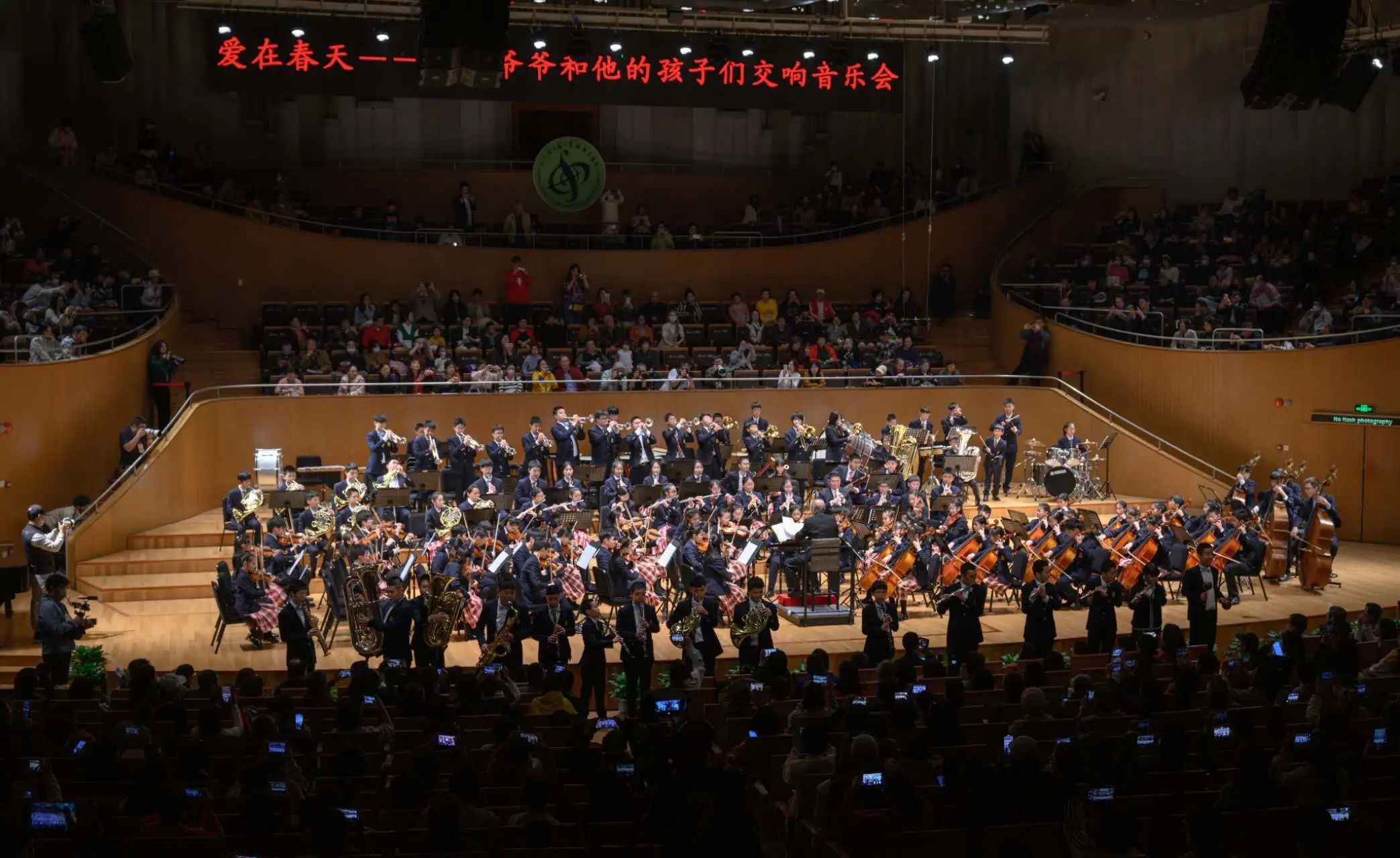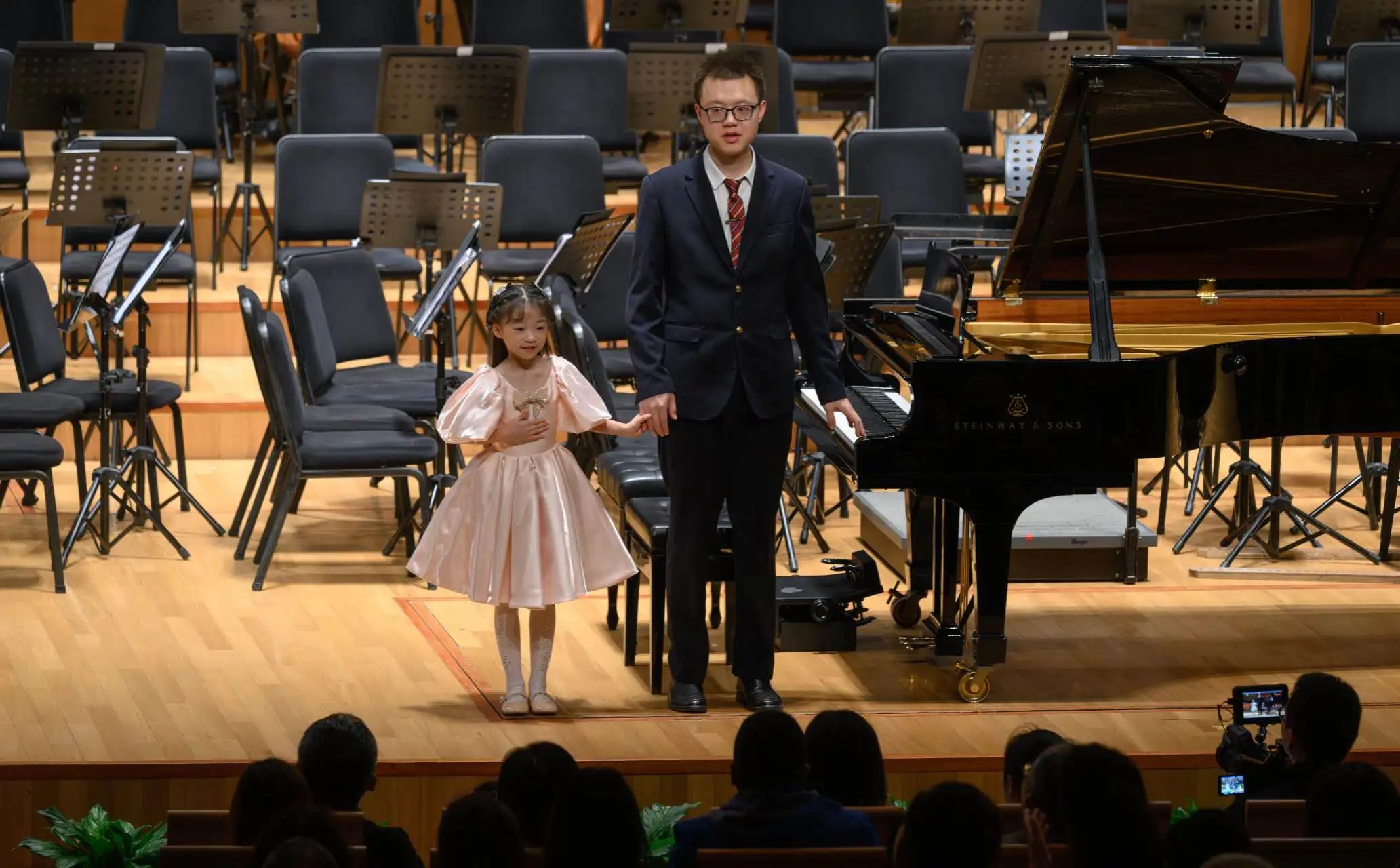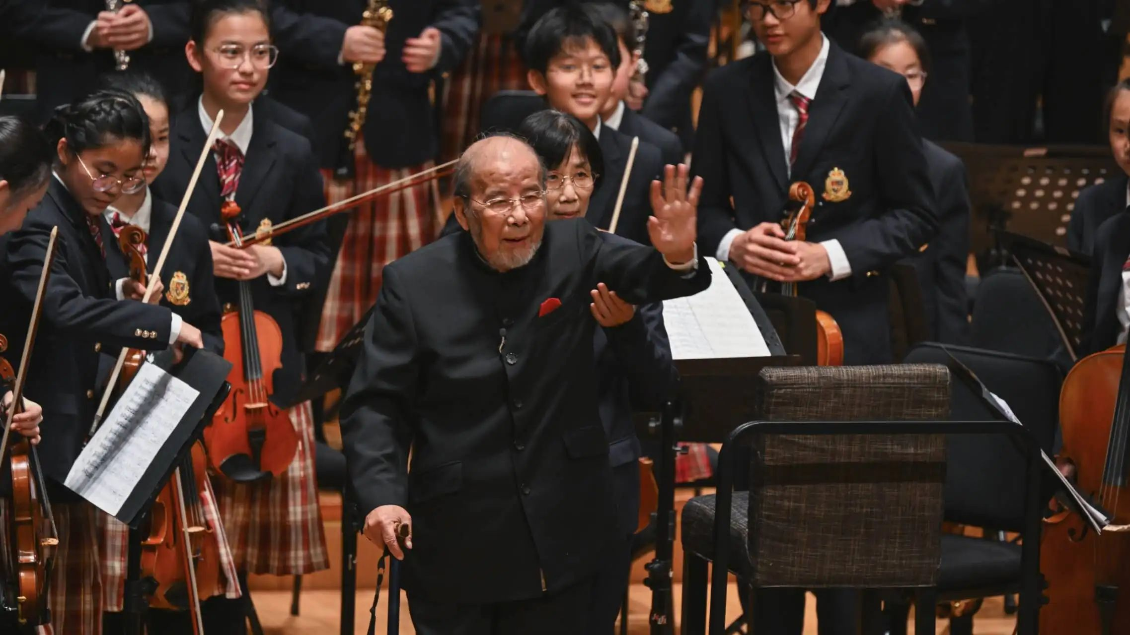 舞台上的曹鹏是不老的“90后”。演出开始前,他在女儿曹小夏的搀扶下,慢慢地坐上了指挥椅;一拿起指挥棒,他立刻精神奕奕,左手熟练翻谱,右手挥棒有力,时而用眼神与演奏中的孩子们交流。